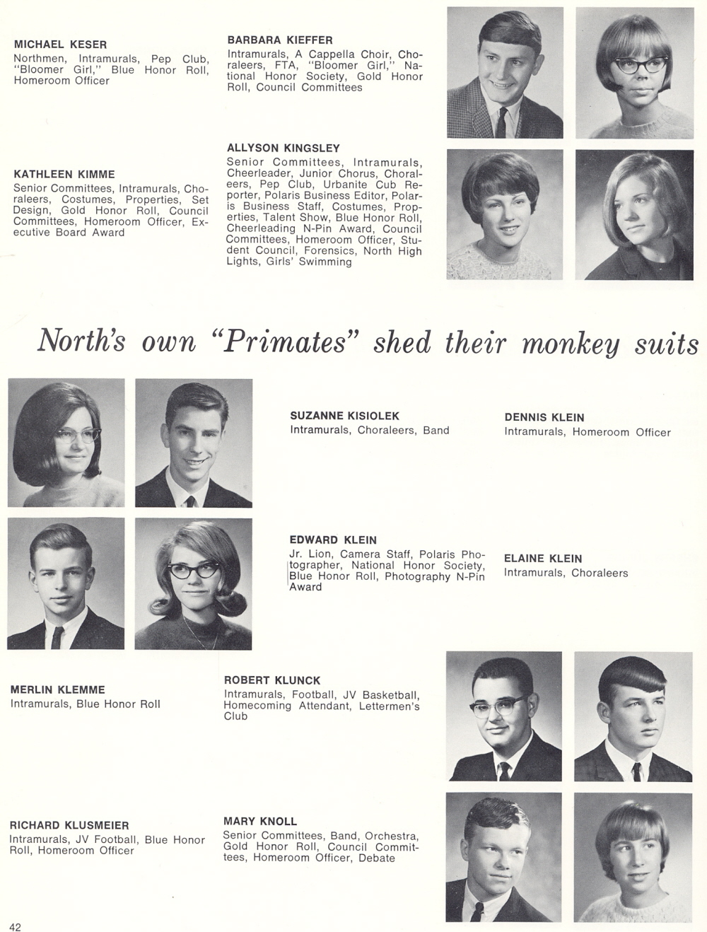 1967 Sheboygan North High School, Page 42: Michael Kesar, Barbara Kieffer, Kathleen Kimme, Allyson Kingsley, Suzanne Kisiolek, Dennis Klein, Edward Klein, Elaine Klein, Merline Klemme, Robert Klunck, Richard Klusmeier, Mary Knoll.
