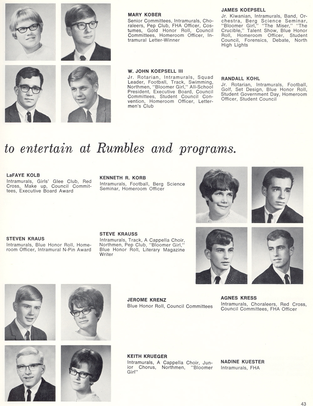 1967 Sheboygan North High School, Page 43: Mary Kober, James Koepsell, W. John Koepsell III, Randall Kohl, LaFaye Kolb, Kenneth R. Korb, Steven Kraus, Steve Krauss, Jerome Krenz, Agnes Kress, Keith Krueger, Nadine Kuester.
