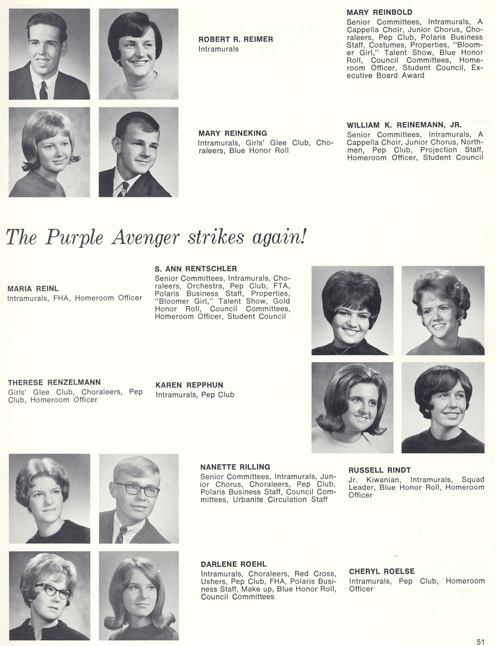 1967 Sheboygan North High School, Page 51: Robert R. Reimer, Mary Reinbold, Mary Reineking, William K. Reinemann, Jr., Maria Reinl, S. Ann Rentschler, Therese Renzelmann, Karen Repphun, Nanette Rilling, Russell Rindt, Darlene Roehl, Cheryl Roelse.