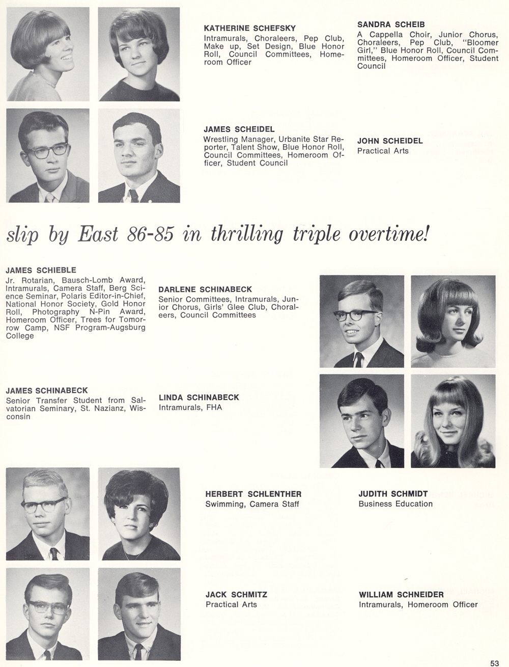 1967 Sheboygan North High School, Page 53: Katherine Schefsky, Sandra Scheib, James Scheidel, John Scheidel, James Schieble, Darlene Schinabeck, James Schinabeck, Linda Schinabeck, Herbert Schlenther, Judith Schmidt, Jack Schmidt, William Schneider.
