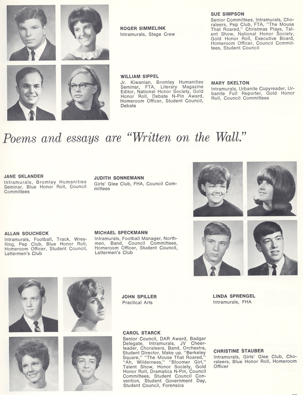 1967 Sheboygan North High School, Page 55: Roger Simmelink, Sue Simpson, William Sippel, Mary Skelton, Jane Sklander, Judith Sonnemann, Allan Soucheck, Michael Speckmann, John Spiller, Linda Sprengel, Carol Starck, Christine Stauber.