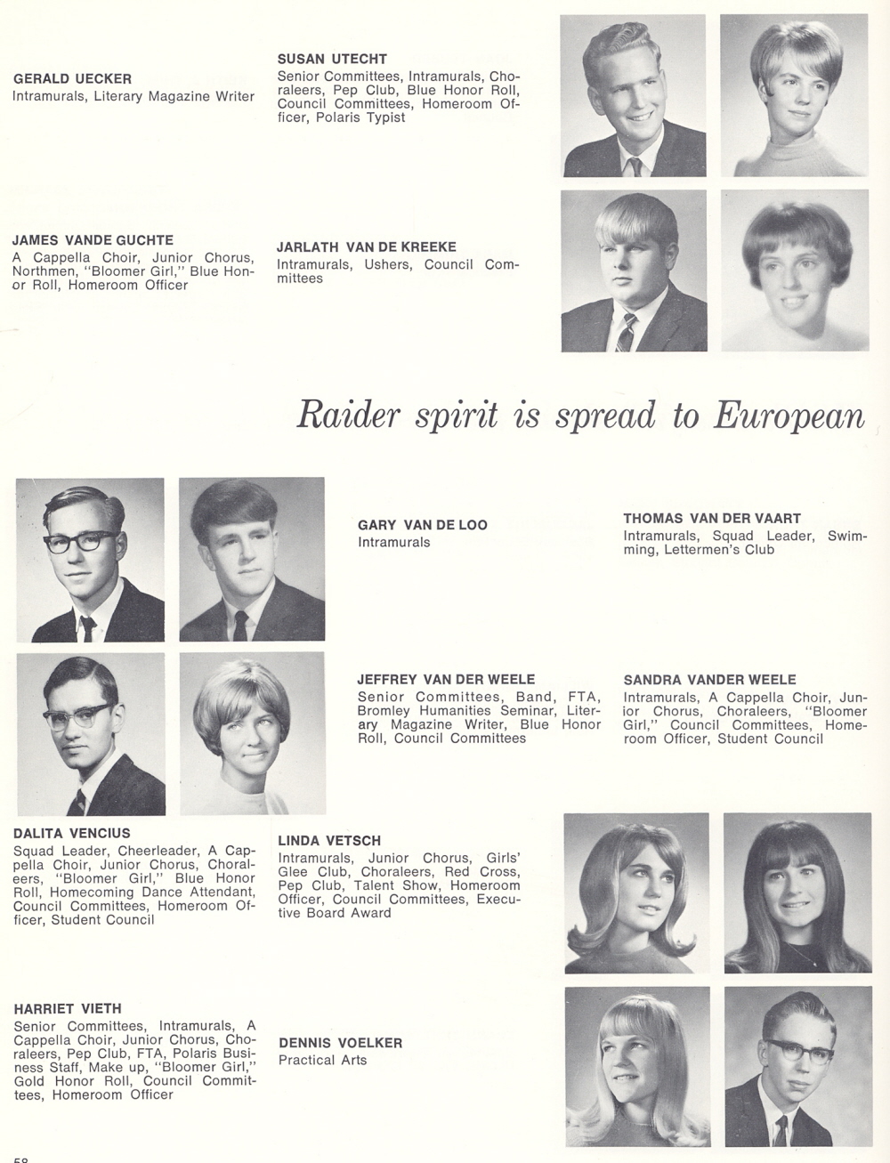 High School, Page 58: Gerald Uecker, Susan Utecht, James Vande Guchte, Jarlath Van De Kreeke, Gary Van De Loo, Thomas Van Der Vaart, Jeffrey Van Der Weele, Sandra Vander Weele, Dalita Vencius, Linda Vetsch, Harriet Vieth, Dennis Voelker.