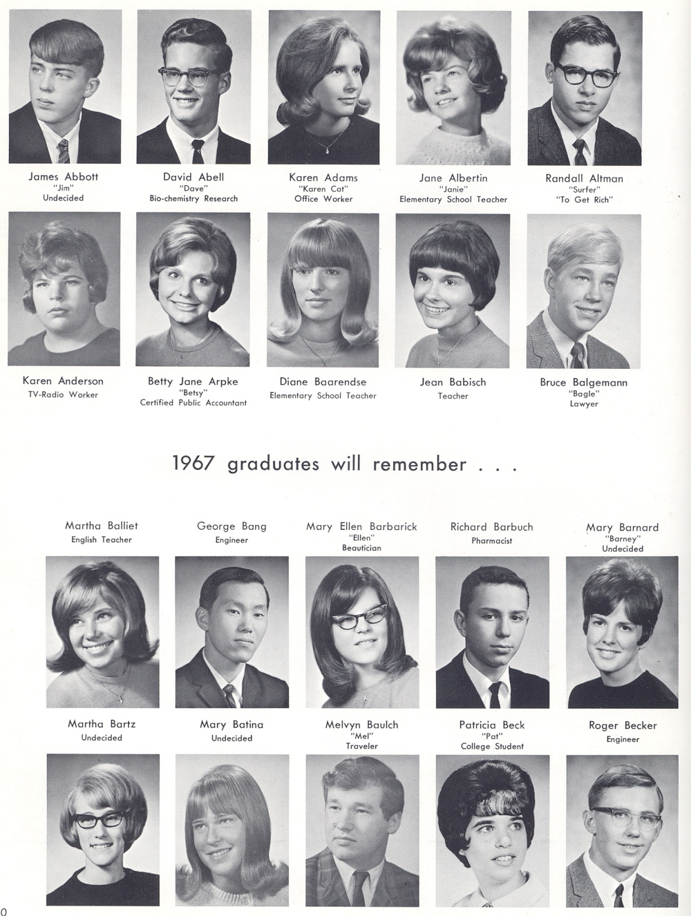 High School, Page 40: James Abbott, David Abell, Karen Adams, Jane Albertin, Randall Altman, Karen Anderson, Betty Jane Arpke, Diane Baarendse, Jean Babisch, Bruce Balgemann, Martha Balliet, George Bang, Mary Ellen Barbarick, Richard Barbuch, Mary Barnard, Martha Bartz, Mary Batina, Melvyn Baulch, Patricia Beck, Roger Becker.
