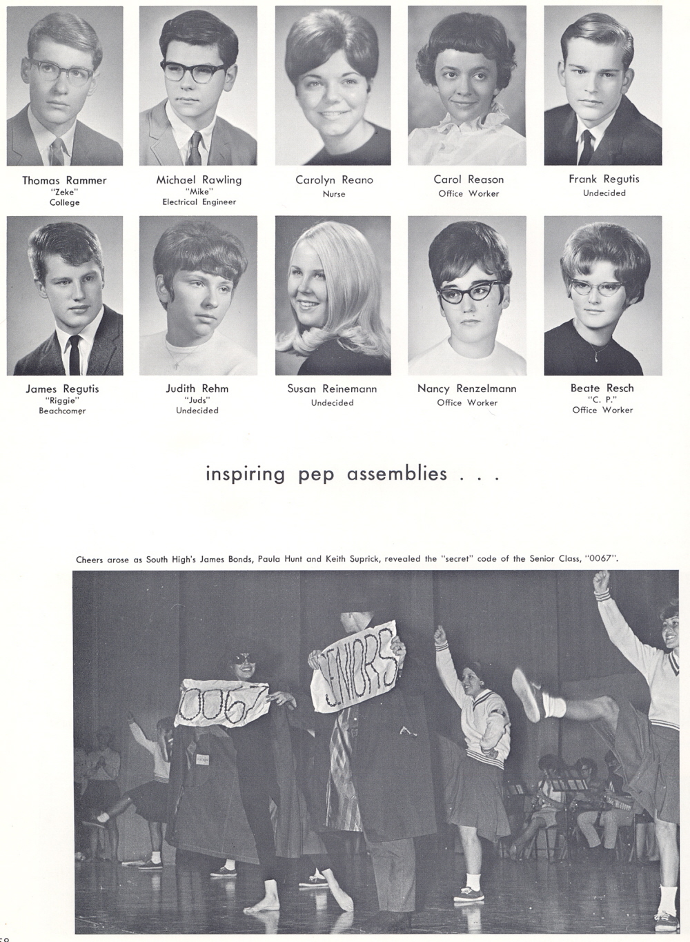1967 Sheboygan South High School, Page 58: Thomas Rammer, Michael Rawling, Carolyn Reano, Carol Reason, Frank Regutis, James Regutis, Judith Rehm, Susan Reinemann, Nancy Renzelmann, Beate Resch.