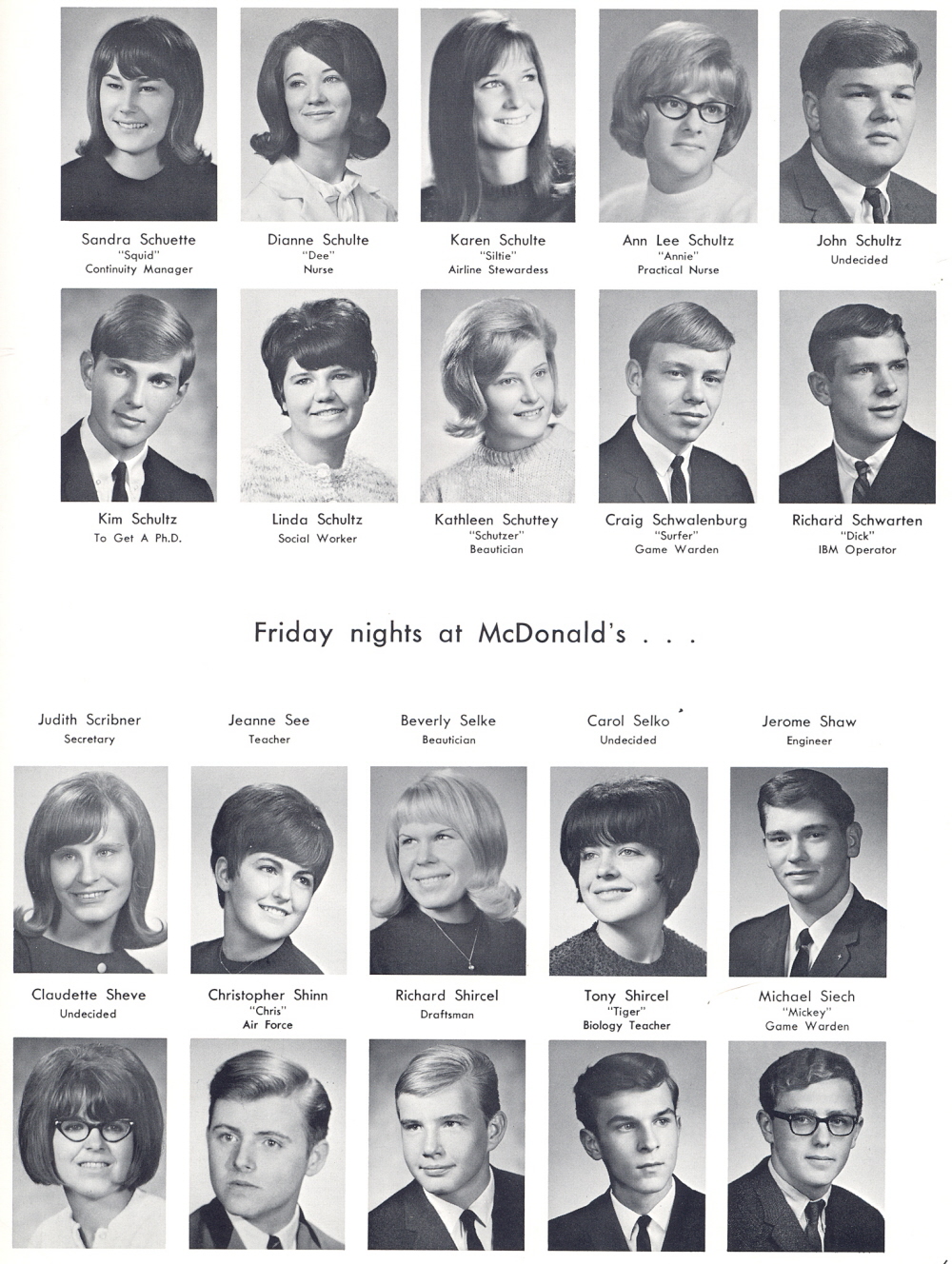 High School, Page 61: Sandra Schuette, Dianne Schulte, Karen Schulte, Ann Lee Schultz, John Schultz, Kim Schultz, Linda Schultz, Kathleen Schuttey, Craig Schwalenburg, Richard Schwarten, Judith Scribner, Jeanne See, Beverly Selke, Carol Selko, Jerome Shaw, Claudette Sheve, Christopher Shinn, Richard Shircel, Tony Shircel, Michael Siech.
