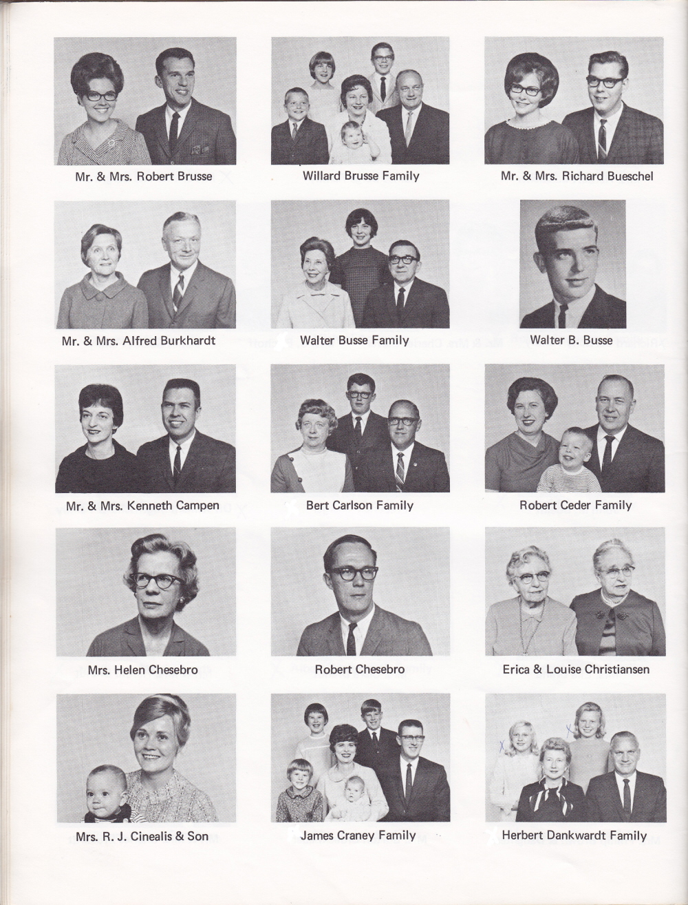 1968 First United Lutheran Church of Sheboygan, Page 17: Mr. and Mrs. Robert Brusse, Willard Brusse Family, Mr. and Mrs. Richard Bueschel, Mr. and Mrs. Alfred Burkhardt, Walter Busse Family, Walter B. Busse, Mr. and Mrs. Kenneth Campen, Bert Carlson Family, Robert Ceder Family, Mrs. Helen Chesebro, Robert Chesebro, Erica and Louise Christiansen, Mrs. R. J. Cinealis and Son, James Craney Family, Herbert Dankwardt Family.