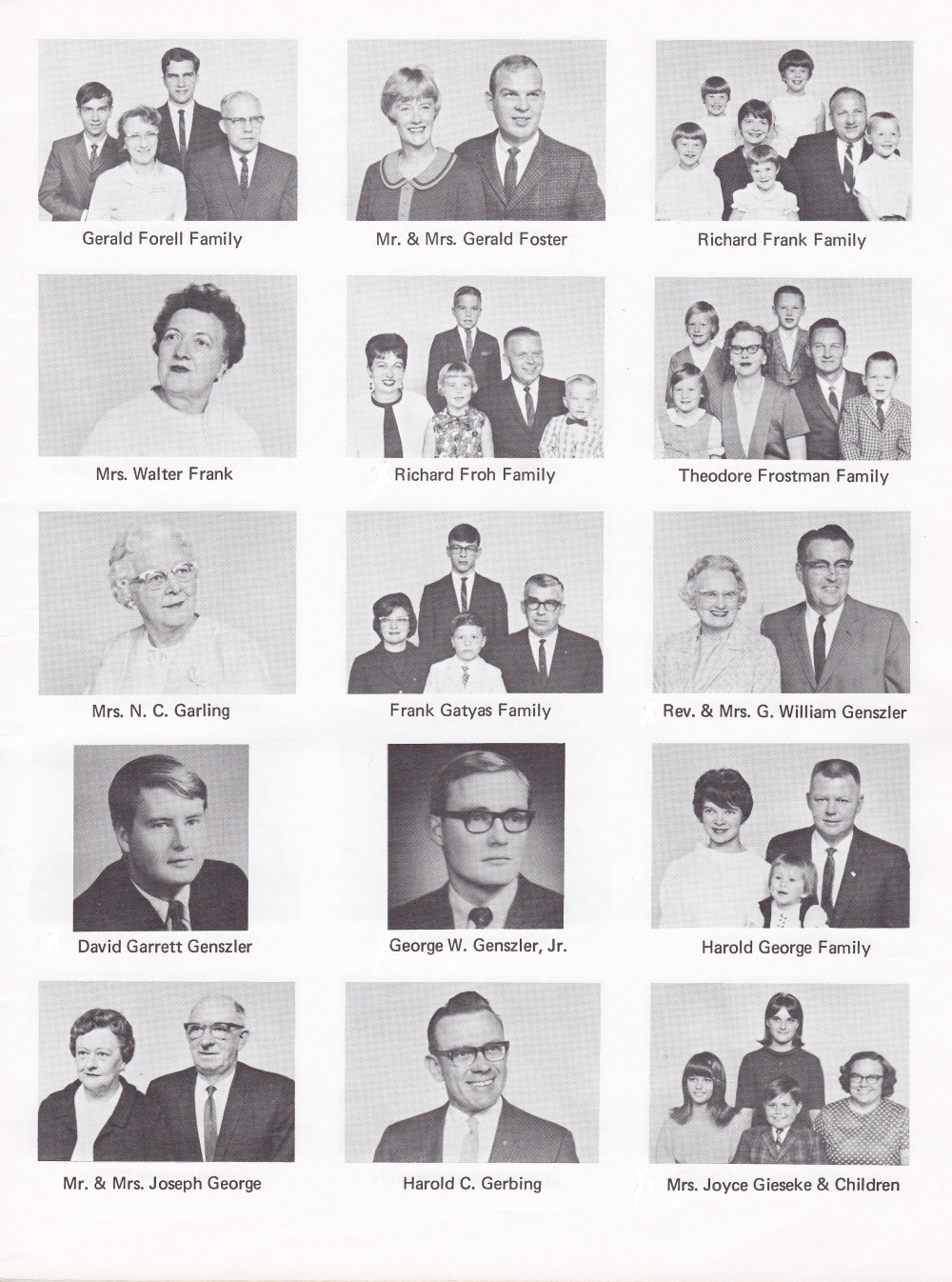 1968 First United Lutheran Church of Sheboygan, Page 20: Gerald Forell Family, Mr. and Mrs. Gerald Foster, Richard Frank Family, Mrs. Walter Frank, Richard froh Family, Theodore Frostman Family, Mrs. N. C. Garling, Frank Gatyas Family, Rev. and Mrs. G. William Genszler, David Garrett Genszler, George W. Genszler, Jr., Harold George Family, Mr. and Mrs. Joseph George, Harold C. Gerbing, Mrs. Joyce Gieseke and Children.