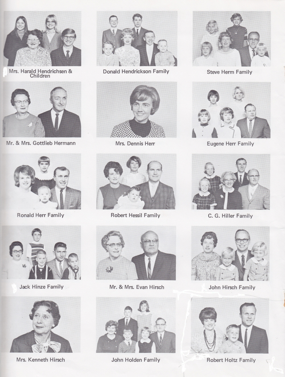 1968 First United Lutheran Church of Sheboygan, Page 23: Mrs. Harald Hendrichsen and Children, Donald Hendrickson Family, Steve Herm Family, Mr. and Mrs. Gottlieb Hermann, Mrs. Dennis Herr, Eugene Herr Family, Ronald Herr Family, Robert Hessil Family, C. G. Hiller Family, Jack Hinze Family, Mr. and Mrs. Evan Hirsch, John Hirsch Family, Mrs. Kenneth Hirsch, John Holdon Family, Robert Holtz Family.