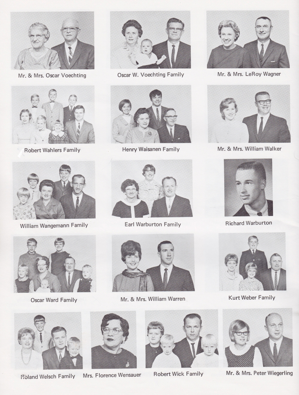 1968 First United Lutheran Church of Sheboygan, Page 37: Mr. and Mrs. Oscar Voechting, Oscar W. Voechting Family, Mr. and Mrs. LeRoy Wagner, Robert Wahlers Family, Henry Waisanen Family, Mr. and Mrs. William Walker, William Wangemann Family, Earl Warburton Family, Rivhard Warburton, Oscar Ward Family, Mr. and Mrs. William Warren, Kurt Weber Family, Roland Welsch Family, Mrs. Florence Wensauer, Robert Wick Family, Mr. and Mrs. Peter Wiegerling.