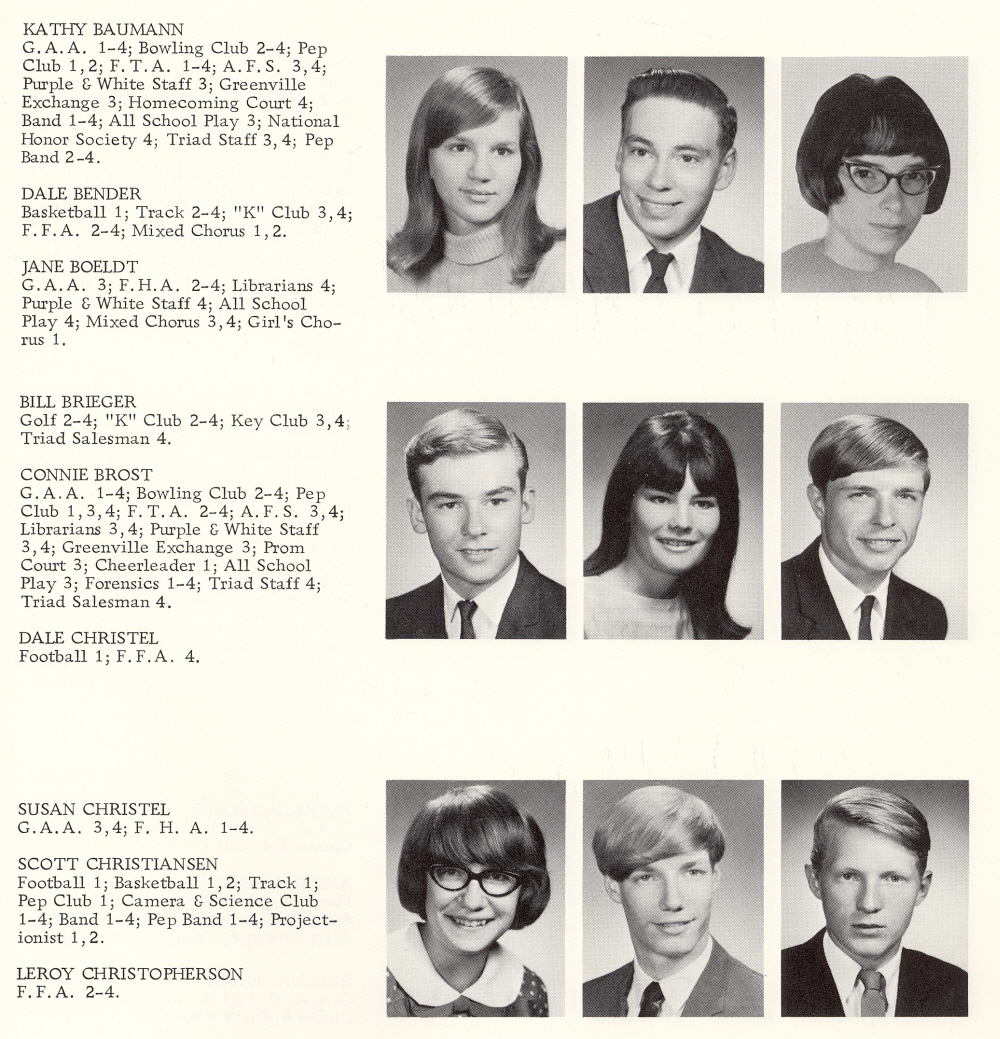 1968 Kiel High School, Page 21: Kathy Baumann, Dale Bender, Jane Boeldt, Bill Brieger, Connie Brost, Dale Christel, Susan Christel, Scott Christiansen, Leroy Christopherson.