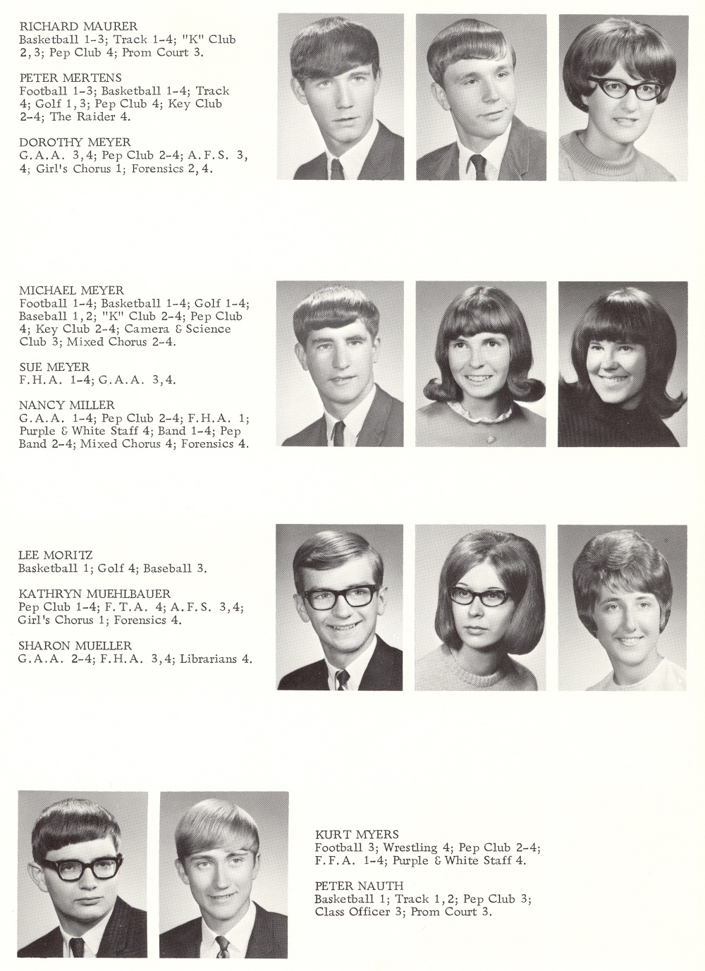 1968 Kiel High School, Page 26: Richard Maurer, Peter Mertens, Dorothy Meyer, Michael Meyer, Sue Meyer, Nancy Miller, Lee Moritz, Kathryn Muehlbauer, Sharon Mueller, Kurt Myers, Peter Nauth.