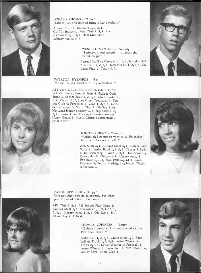 1968 Oostburg High School, Page 14: Donald Ludens, Wendell Mentink, Patricia Nyenhuis, Bonita Ongna, Carol Oppeneer, Thomas Oppeneer.