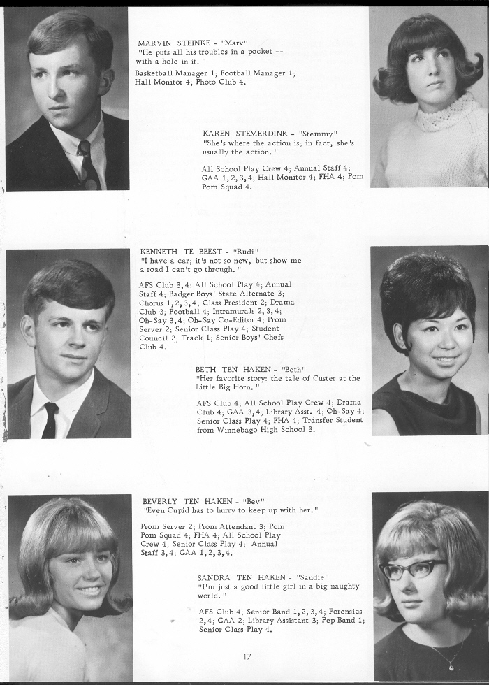1968 Oostburg High School, Page 17: Marvin Steinke, Karen Stemerdink, Kenneth Te Beest, Beth Ten Haken, Beverly Ten Haken, Sandra Ten Haken.