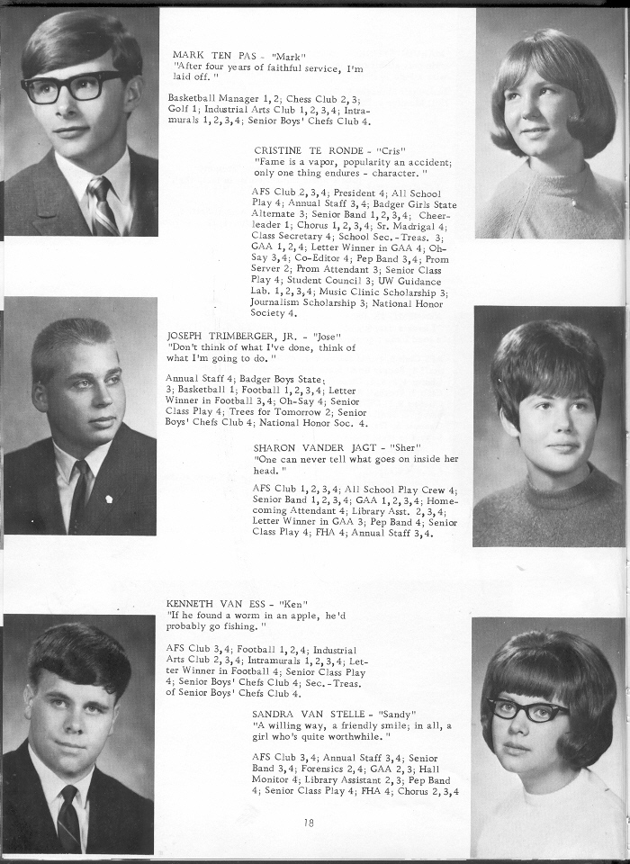 1968 Oostburg High School, Page 18: Mark Ten Pas, Christine Te Ronde, Joseph Trimberger, Sharon Vander Jagt, Kenneth Van Ess, Sandra Van Stelle.
