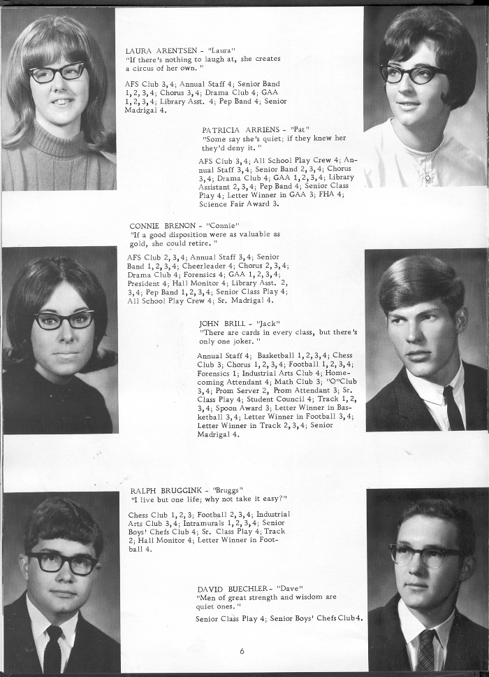 1968 Oostburg High School, Page 6: Laura Arentsen, Patricia Arriens, Connie Brenon, John Brill, Ralph Bruggink, David Buechler.