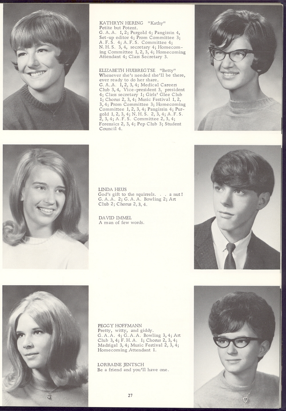 1968 Sheboygan Falls High School, Page 27: Kathryn Hering, Linda Heus, Peggy Hoffmann, Elizabeth Huibregtse, David Immel, Lorraine Jentsch.