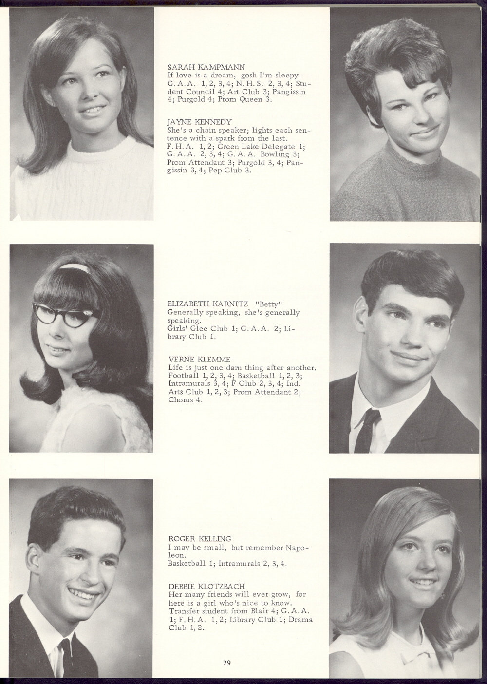 1968 Sheboygan Falls High School, Page 29: Sarah Kampmann, Elizabeth Karnitz, Roger Kelling, Jayne Kennedy, Verne Klemme, Debbie Klotzbach.