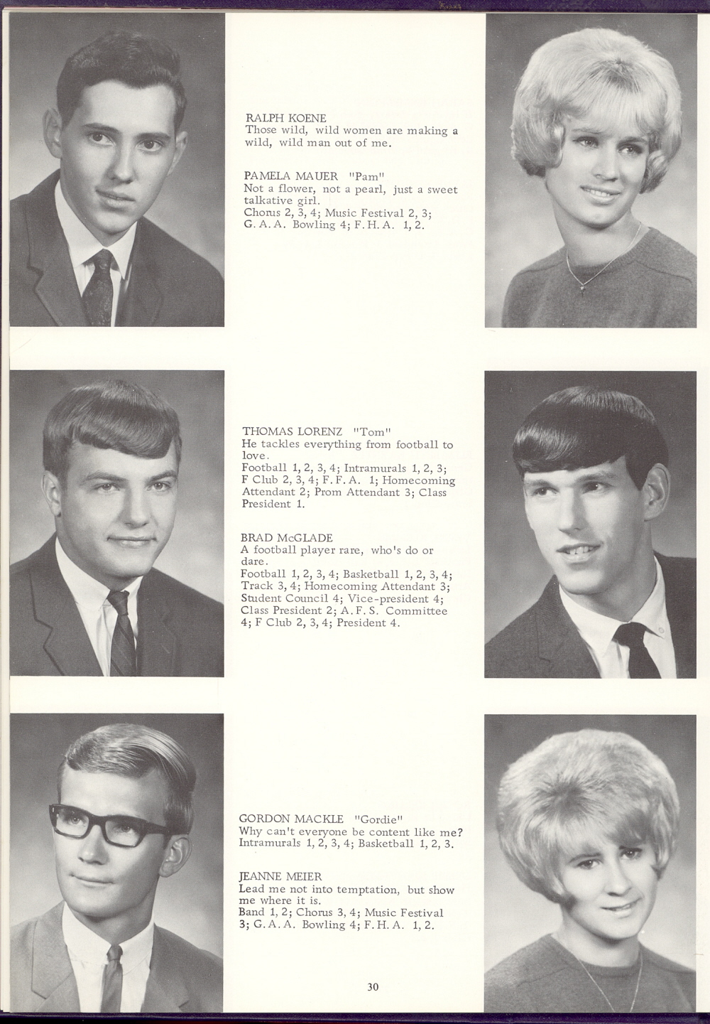 1968 Sheboygan Falls High School, Page 30: Ralph Koene, Thomas Lorenz, Gordon Mackle, Pamela Mauer, Brad McGlade, Jeanne Meier.