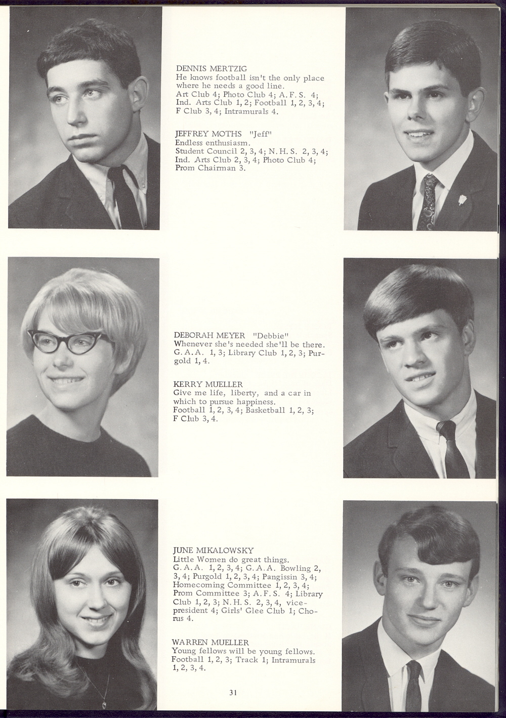 1968 Sheboygan Falls High School, Page 31: Dennis Mertzig, Deborah Meyer, June Mikalowsky, Jeffrey Moths, Kerry Mueller, Warren Mueller.