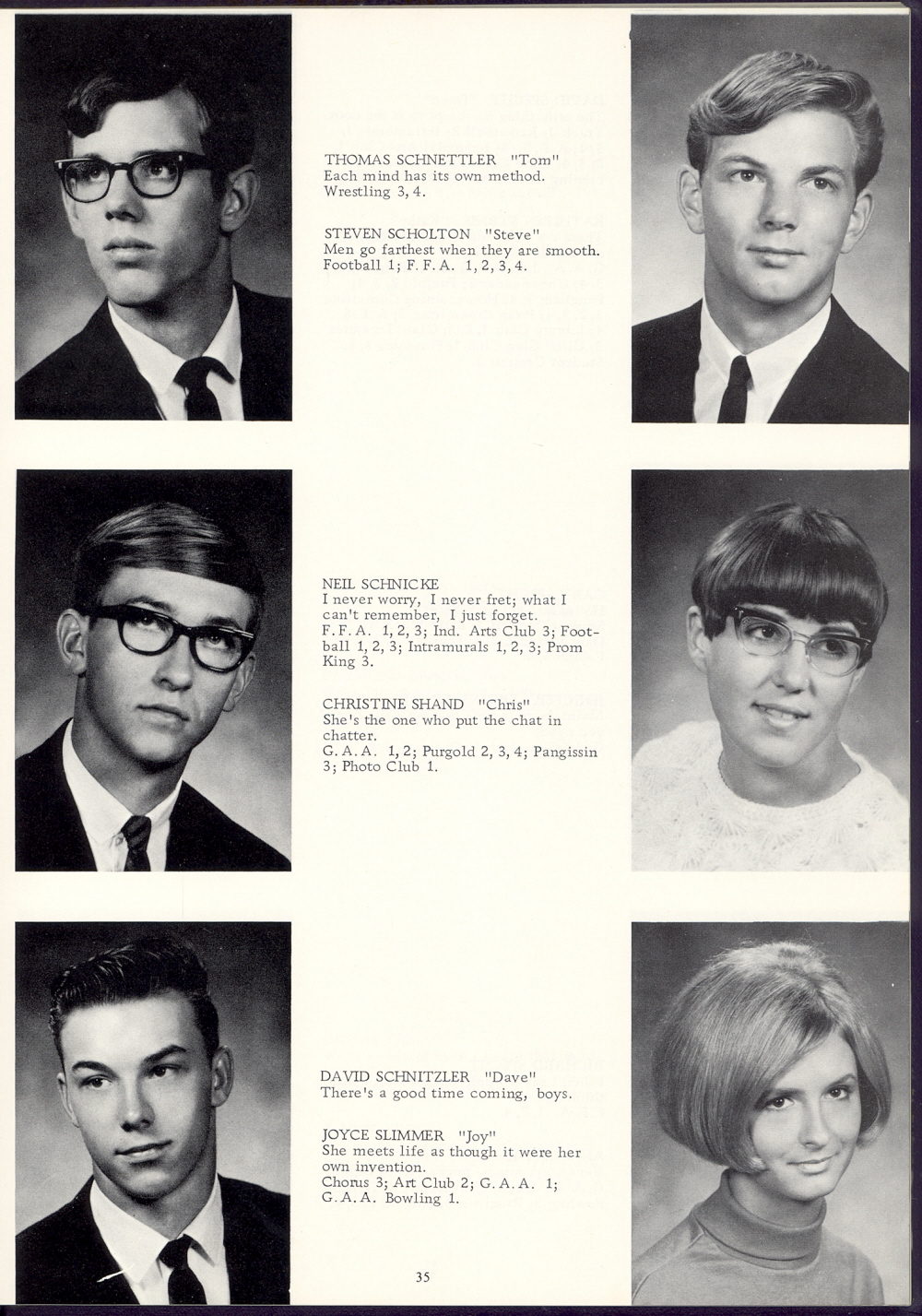 1968 Sheboygan Falls High School, Page 35: Thomas Schnettler, Neil Schnicke, David Schnitzler, Steven Scholton, Christine Shand, Joyce Slimmer.
