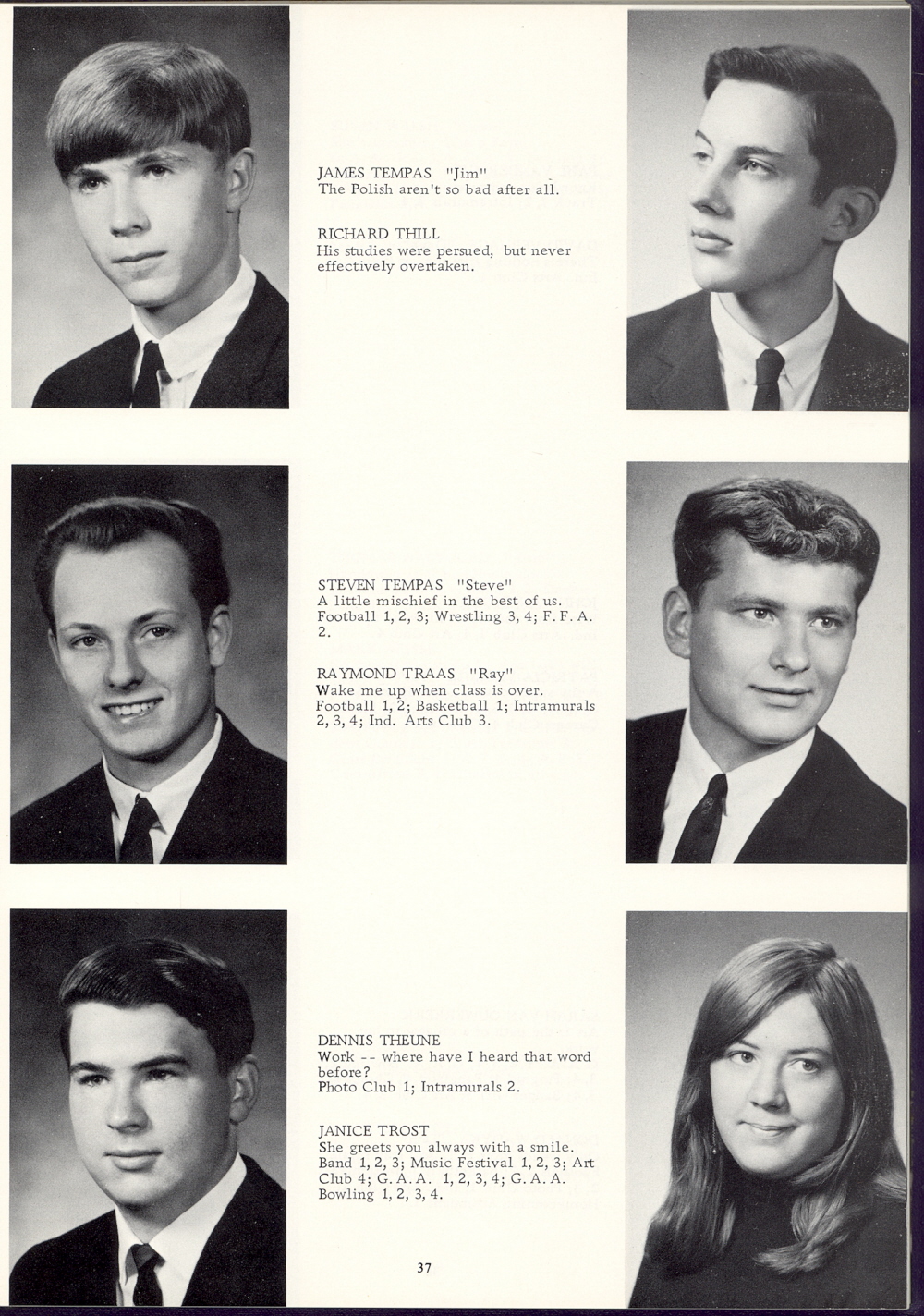 1968 Sheboygan Falls High School, Page 37: James Tempas, Steven Tempas, Dennis Theune, Richard Thill, Raymond Traas, Janice Trost.