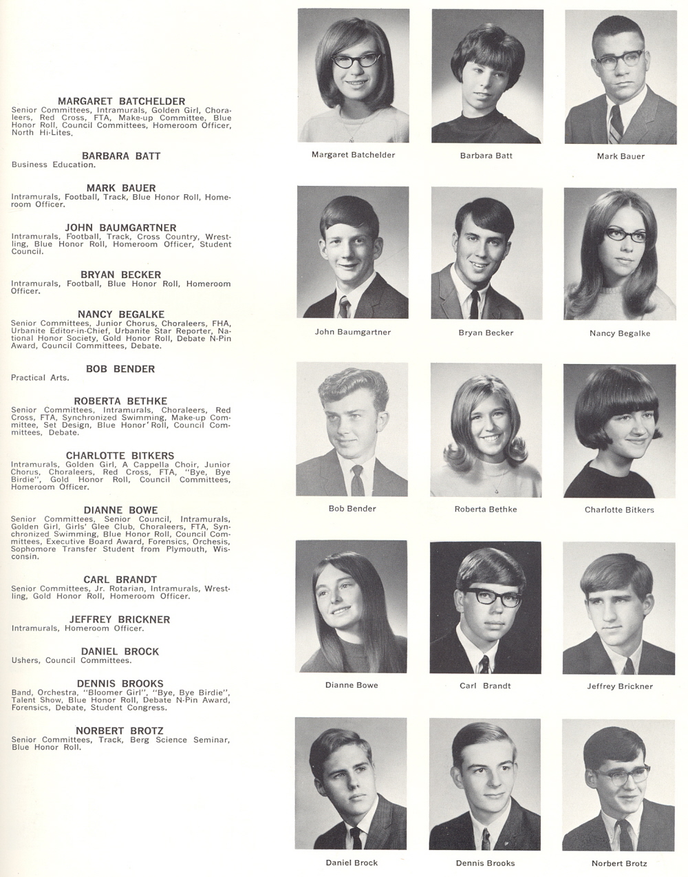 1968 Sheboygan North High School, Page 105: Margaret Batchelder, Barbara Batt, Mark Bauer, John Baumgartner, Bryan Becker, Nancy Begalke, Bob Bender, Roberta Bethke, Charlotte Bitkers, Dianne Bowe, Carl Brandt, Jeffrey Brickner, Daniel Brock, Dennis Brooks, Norbert Brotz.