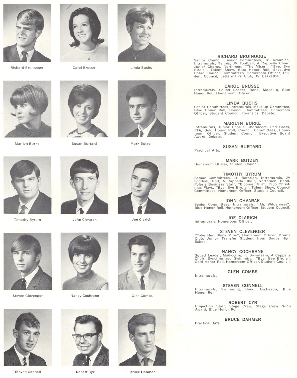1968 Sheboygan North High School, Page 106: Richard Bruinooge, Carol Brusse, Linda Buchs, Marilyn Burke, Susan Burtard, Mark Butzen, Timothy Byrum, John Chvarak, Joe Clarich, Steven Clevenger, Nancy Cochrane, Glen Combs, Steven Connell, Robert Cyr, Bruce Dahmer.