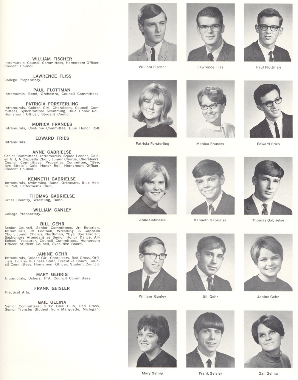 1968 Sheboygan North High School, Page 109: William Fischer, Lawrence Fliss, Paul Flottman, Patricia Forsterling, Monica Frances, Edward Fries, Anne Gabrielse, Kenneth Gabrielse, Thomas Gabrielse, William Ganley, Bill Gehr, Janine Gehr, Mary Gehrig, Frank Geisler, Gail Gelina.