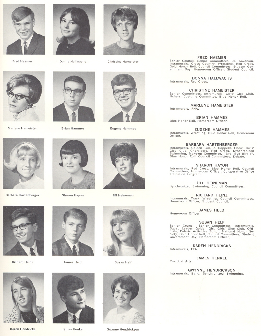 1968 Sheboygan North High School, Page 111: Fred Haemer, Donna Hallwachs, Christine Hameister, Marlene Hameister, Brian Hammes, Eugene Hammes, Barbara Hartenberger, Sharon Hayon, Jill Heineman, Richard Heinz, James Held, Susan Helf, Karen Hendricks, James Henkel, Gwynne Hendrickson.