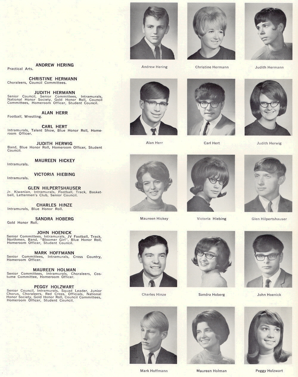 1968 Sheboygan North High School, Page 112: Andrew Hering, Christine Hermann, Judith Hermann, Alan Herr, Carl Hert, Judith Herwig, Maureen Hickey, Victoria Hiebing, Glen Hilpertshauser, Charles Hinze, Sandra Hoberg, John Hoenick, Mark Hoffmann, Maureen Holman, Peggy Holzwart.