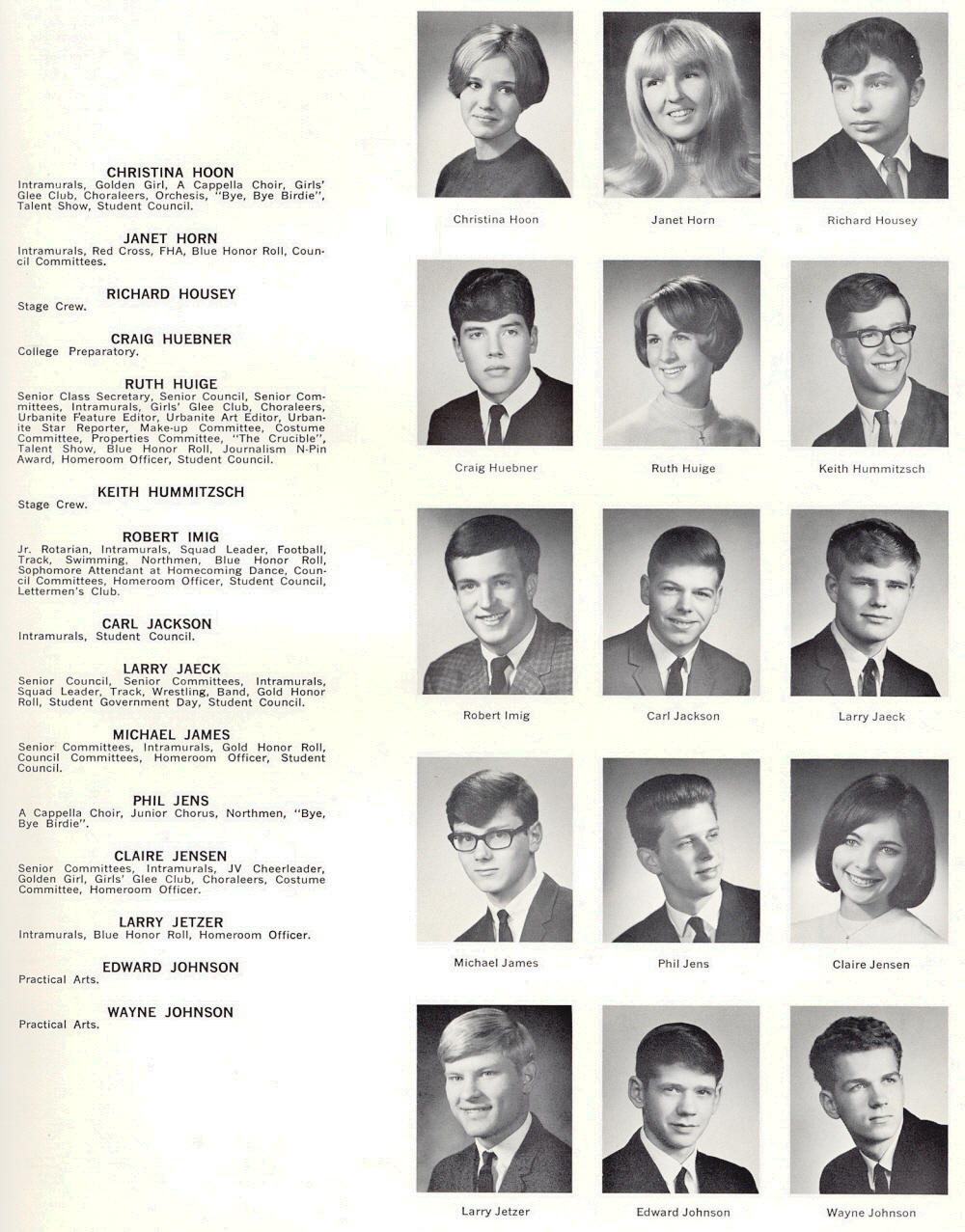 1968 Sheboygan North High School, Page 113: Christina Hoon, Janet Horn, Richart Housey, Craig Huebner, Ruth Huige, Keith Hummitzsch, Robert Imig, Carl Jackson, Larry Jaeck, Michael James, Phil Jens, Claire Jensen, Larry Jetzer, Edward Johnson, Wayne Johnson.