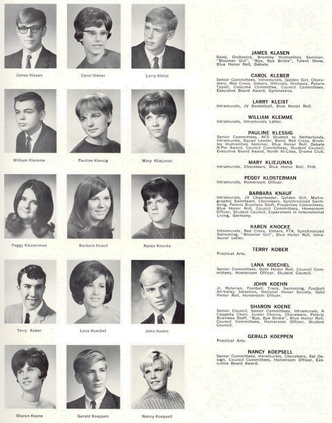 1968 Sheboygan North High School, Page 115: James Klasen, Carol Kleber, Larry Kleist, William Klemme, Pauline Klessig, Mary Kliejunas, Paggy Klosterman, Barbara Knauf, Karen Knocke, Terry Kober, Lana Koechel, John Koehn, Sharon Koene, Gerald Koeppen, Nancy Koepsell.