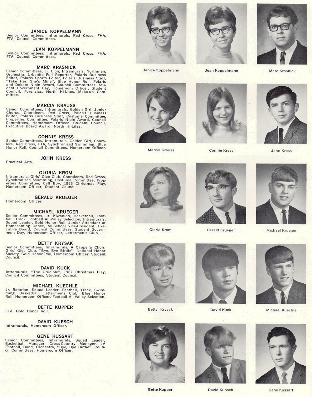 1968 Sheboygan North High School, Page 116: Janice Koppelmann, Jean Koppelmann, Marc Krasnick, Marcia Krauss, Connie Kress, John Kress, Gloria Krom, Gerald Krueger, Michael Krueger, Betty Krysak, David Kuck ,Michael Kuechle, Bette Kupper, David Kupsch, Gene Kussart.