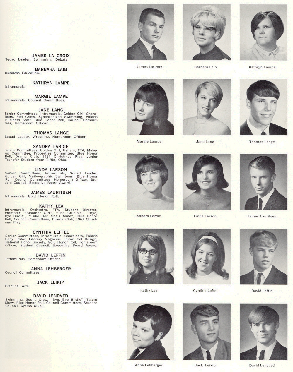 1968 Sheboygan North High School, Page 117: James La Croix, Barbara Laib, Kathryn Lampe, Margie Lampe, Jane Lang, Thomas Lange, Sandra Lardie, Linda Larson, James Lauritsen, Kathy Lea, Cynthia Leffel, David Leffin, Anna Lehberger, Jack Leikip, David Lendved.