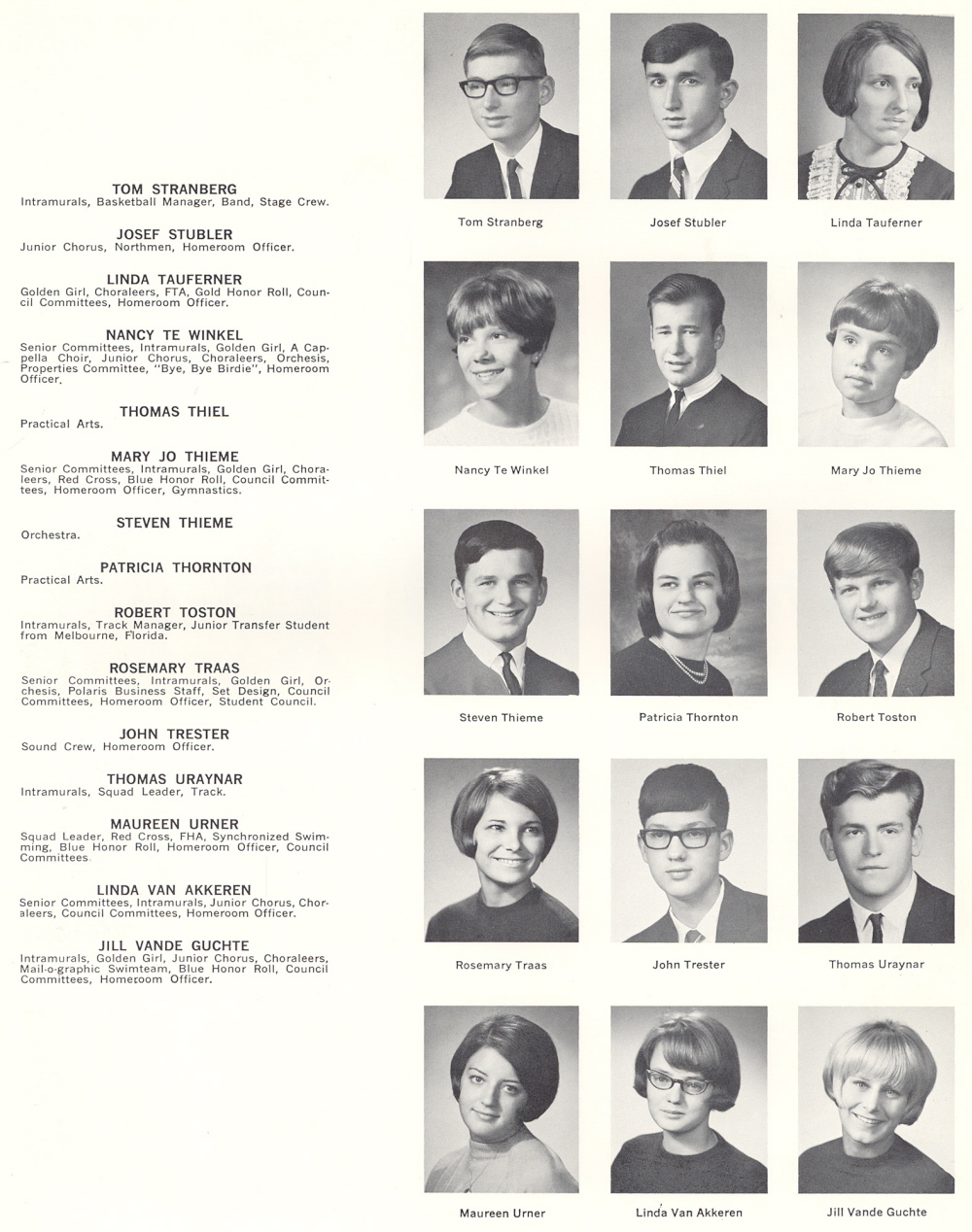 1968 Sheboygan North High School, Page 128: Tom Stranberg, Josef Stubler, Linda Tauferner, Nancy Te Winkel, Thomas Thiel, Mary Thieme, Steven Thieme, Patricia Thornton, Robert Toston, Rosemary Traas, John Trester, Thomas Uraynar, Maureen Urner, Linda Van Akkeren, Jill Vande Guchte.