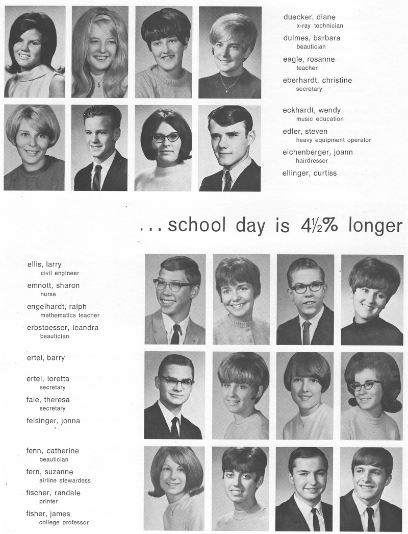 1968 Sheboygan South High School, Page 116: Diane Duecker, Barbara Dulmes, Rosanne Eagle, Christine Everhardt, Wendy Eckhardt, Steven Edler, Joann Eichenberger, Curtiss Ellinger, Larry Ellis, Sharon Emnott, Ralph Engelhardt, Leandra Erbstoesser, Barry Ertel, Loretta Ertel, Theresa Fale, Jonna Felsinger, Catherine Fenn, Suzanne Fern, Randale Fischer, James Fisher.