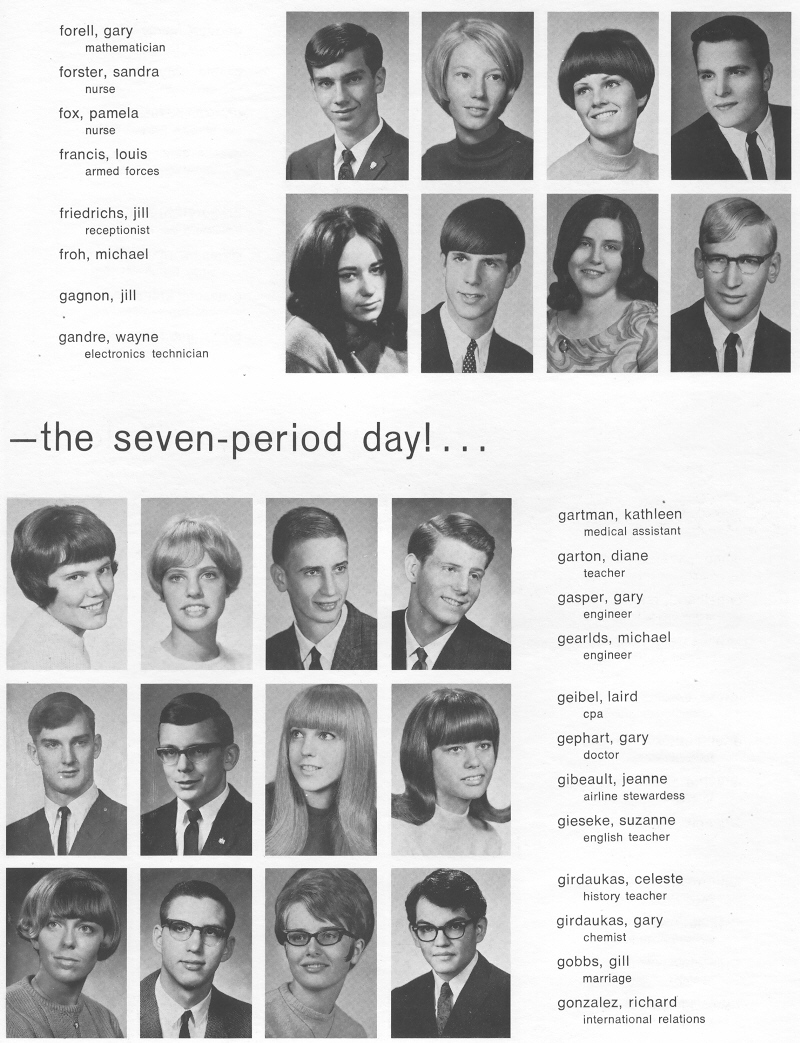 1968 Sheboygan South High School, Page 117: Gary Forell, Sandra Forster, Pamela Fox, Louis Francis, Jill Friedrichs, Michael Froh, Jill Gagnon, Wayne Gandre, Kathleen Gartman, Diane Garton, Gary Gasper, Michael Gearlds, Laird Geibel, Gary Gephart, Jeanne Gibeault, Suzanne Gieseke, Celeste Girdaukas, Gary Girdaukas, Gill Gobbs, Richard Gonzalez.