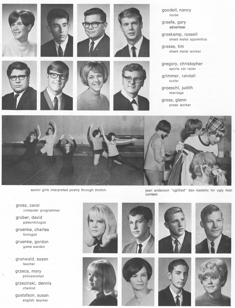 1968 Sheboygan South High School, Page 118: Nancy Goodell, Gary Graefe, Russell Graskamp, Tim Grasse, Christopher Gregory, Randall Grimmer, Judith Groeschl, Glenn Gross, Carol Grosz, David Gruber, Charles Gruenke, Gordon Gruenke, Susan Grunwald, Mary Grzeca, Dennis Grzezinski, Susan Gustafson.