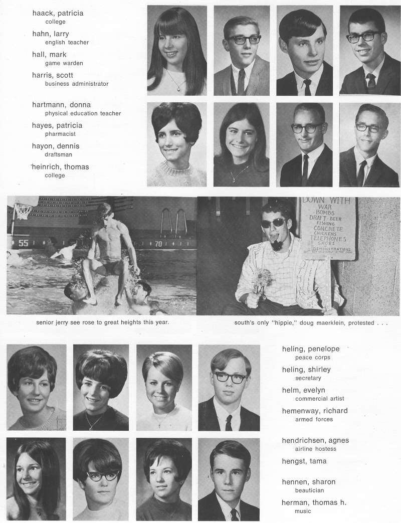 1968 Sheboygan South High School, Page 119: Patricia Haack, Larry Hahn, Mark Hall, Scott Harris, Donna Hartmann, Patricia Hayes, Dennis Hayon, Thomas Heinrich, Penelope Heling, Shirley Heling, Evelyn Helm, Richard Hemenway, Agnes Hendrichsen, Tama Hengst, Sharon Hennen, Thomas Herman.
