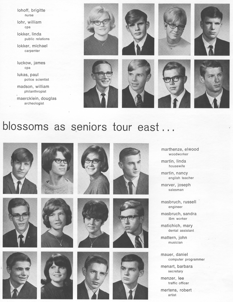 1968 Sheboygan South High School, Page 125: Brigitte Lohoff, William Lohr, Linda Lokker, Michael Lokker, James Luckow, Paul Lukas, William Madson, Douglas Maercklein, Elwood Marthenze, Linda Martin, Nancy Martin, Joseph Marver, Russell Masbruch, Sandra Masbruch, Mary Matichich, John Mattern, Daniel Mauer, Barbara Menart, Lee Menzer, Robert Mertens.
