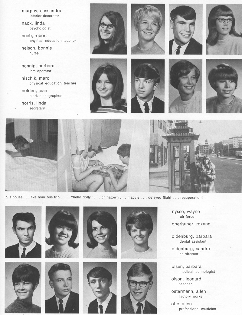 1968 Sheboygan South High School, Page 127: Cassandra Murphy, Linda Nack, Robert Neeb, Bonnie Nelson, Barbara Nennig, Marc Nischik, Jean Nolden, Linda Norris, Wayne Nysse, Roxann Oberhuber, Barbara Oldenburg, Sandra Oldenburg, Barbara Olsen, Leonard Olson, Allen Ostermann, Allen Otte.