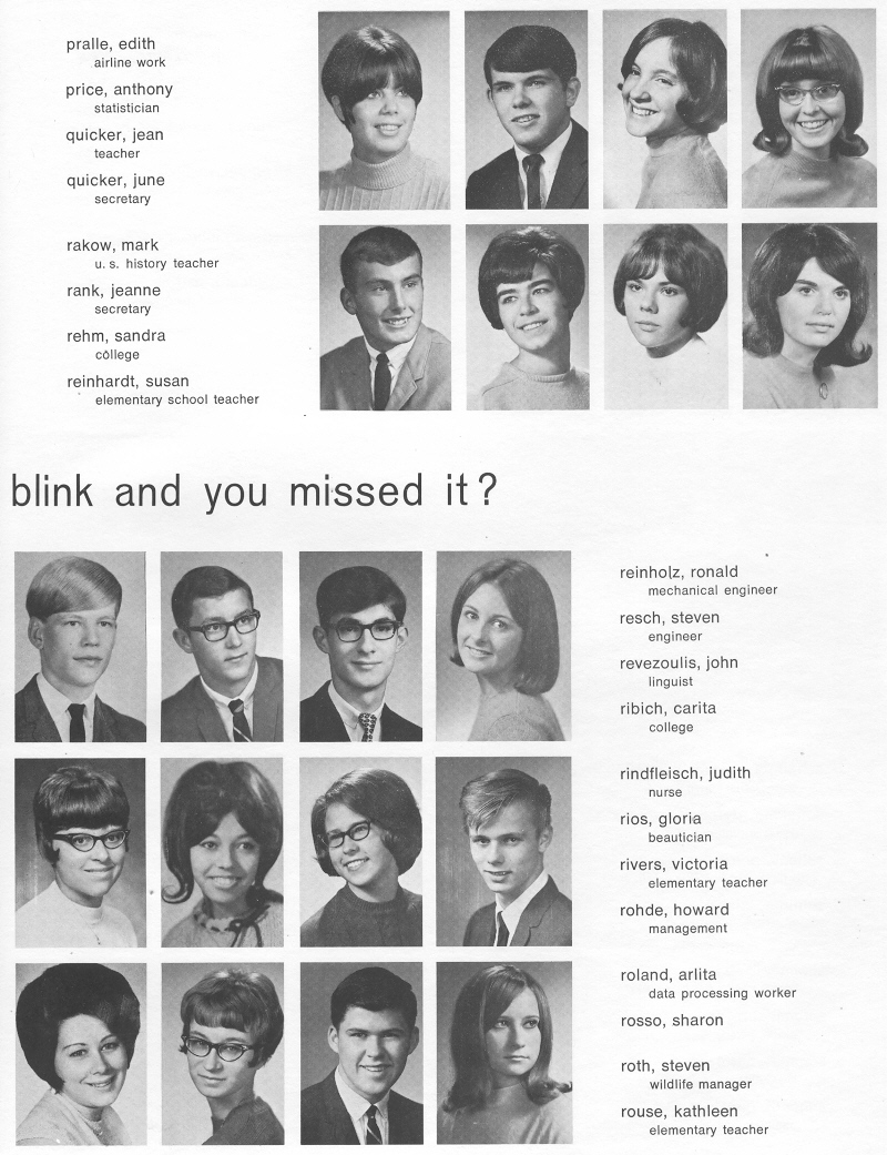 1968 Sheboygan South High School, Page 129: Edith Pralle, Anthony Price, Jean Quicker, June Quicker, Mark Rakow, Jeanne Rank, Sandra Rehm, Susan Reinhardt, Ronald Reinholz, Steven Resch, John Revezoulis, Carita Ribich, Judith Rindfleisch, Gloria Rios, Victoria Rivers, Howard Rohde, Arlita Roland, Sharon Rosso, Steven Roth, Kathleen Rouse.