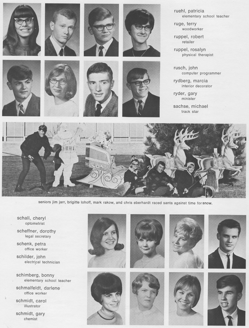 1968 Sheboygan South High School, Page 130: Patricia Ruehl, Terry Ruge, Robert Ruppel, Rosalyn Ruppel, John Rusch, Marcia Rydberg, Gary Ryder, Michael Sachse, Cheryl Schall, Dorothy Scheffner, Petra Schenk, John Schilder, Bonny Schimberg, Darlene Schmalfeldt, Carol Schmidt, Gary Schmidt.