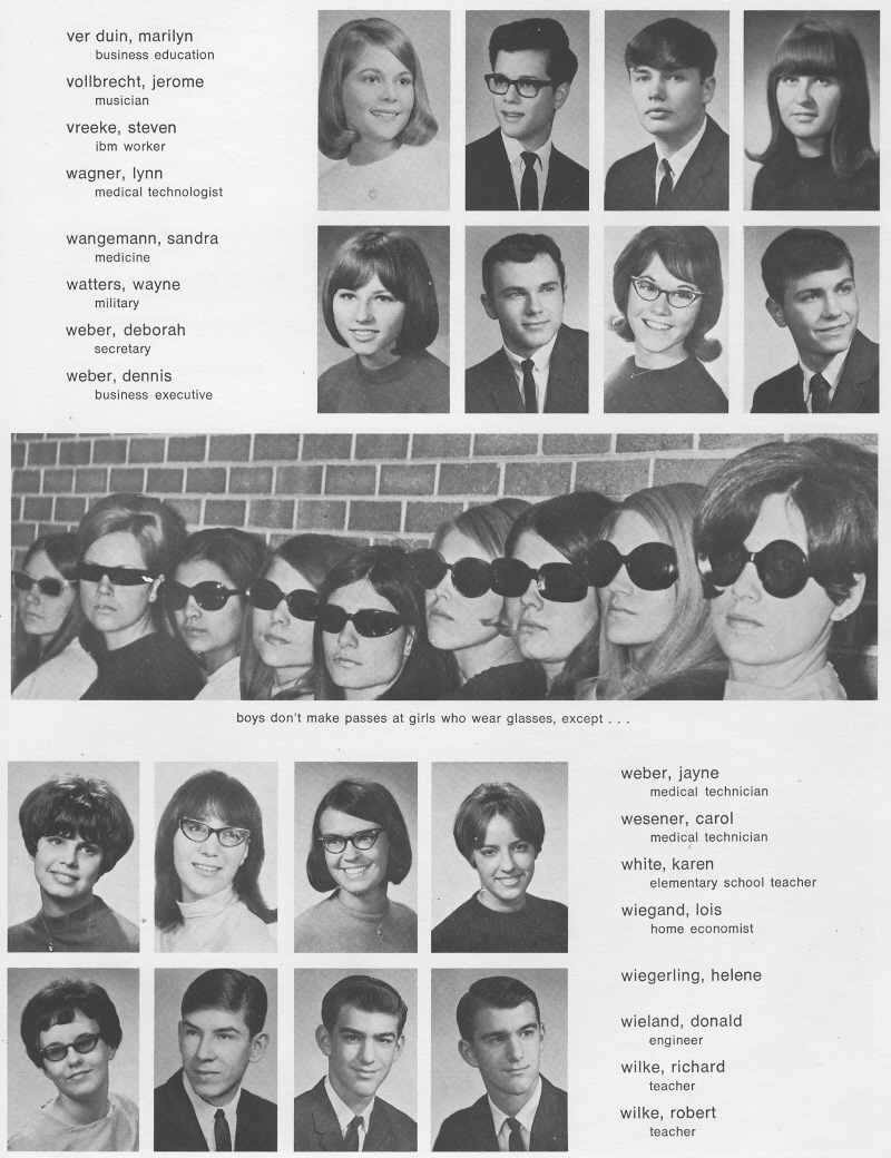 1968 Sheboygan South High School, Page 135: Marilyn Ver Duin, Jerome Vollbrecht, Steven Vreeke, Lynn Wagner, Sandra Wangemann, Wayne Watters, Deborah Weber, Dennis Weber, Jayne Weber, Carol Wesener, Karen White, Lois Wiegand, Helene Wiegerling, Donald Wieland, Richard Wilke, Robert Wilke.