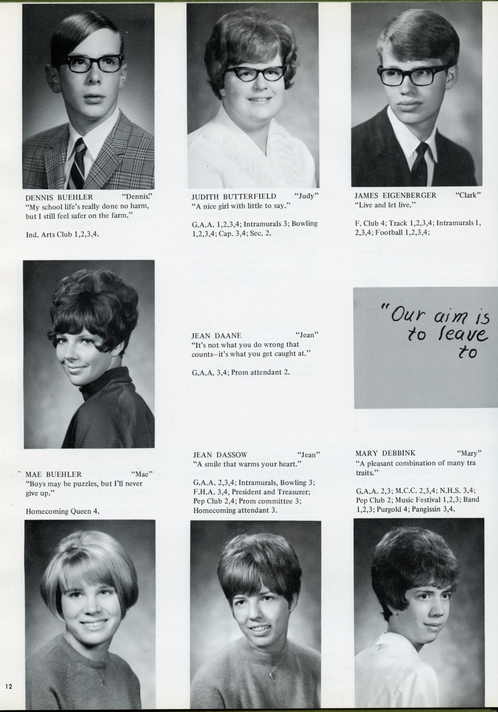 1969 Sheboygan Falls High School, Page 12: Dennis Buehler, Judith Butterfield, James Eigenberger, Jean Daane, Mae Buehler, Jean Dassow, Mary Debbink.