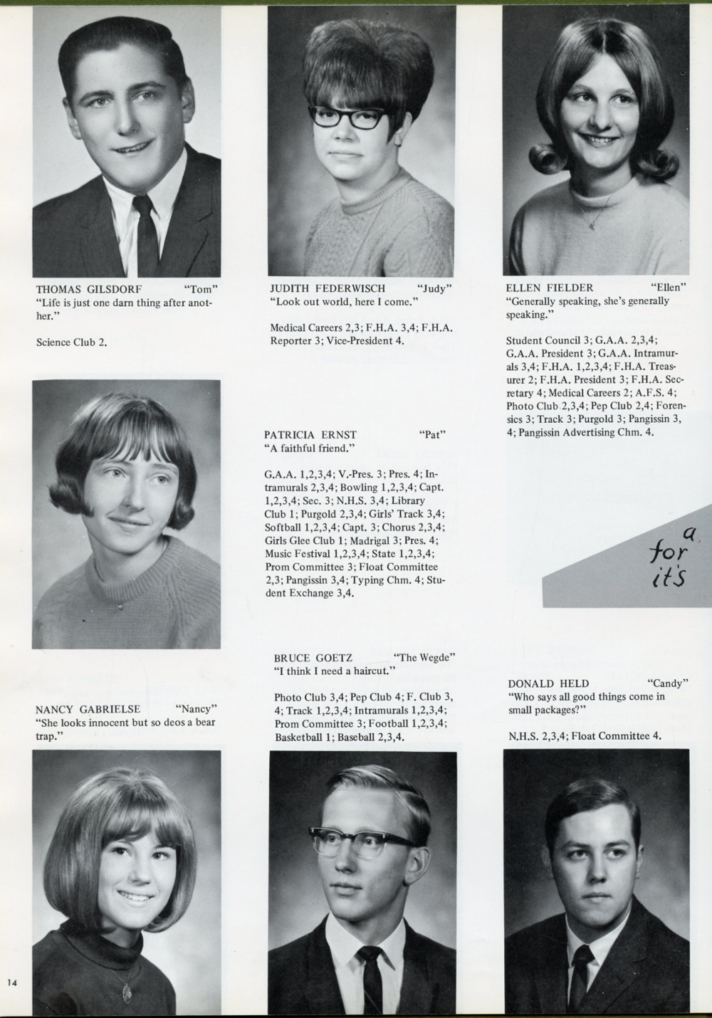 1969 Sheboygan Falls High School, Page 14: Thomas Gilsdorf, Judith Federwisch, Ellen Fielder, Patricia Ernst, Nancy Gabrielse, Bruce Goetz, Donald Held.