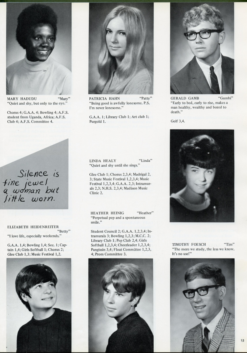 1969 Sheboygan Falls High School, Page 15: Mary Hadudu, Patricia Hahn, Gerald Gamb, Linda Healy, Elizabeth Heidenreiter, Heather Heinig, Timothy Foesch.