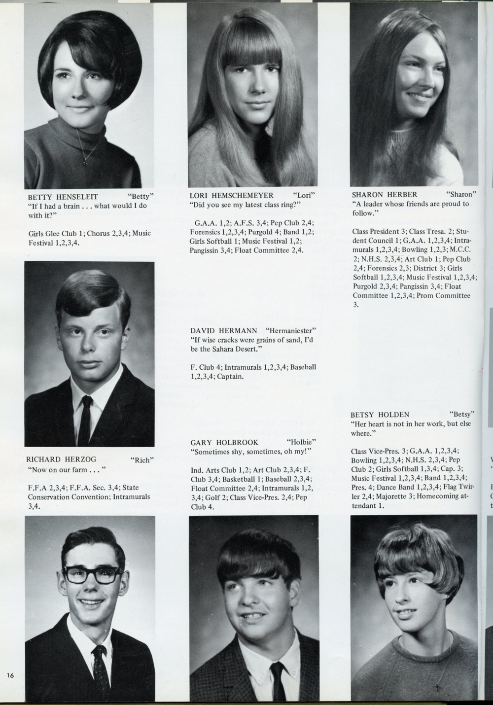1969 Sheboygan Falls High School, Page 16: Betty Henseleit, Lori Hemschemeyer, Sharon Herber, David Herman, Richard Herzog, Gary Holbrook, Betsy Holden.