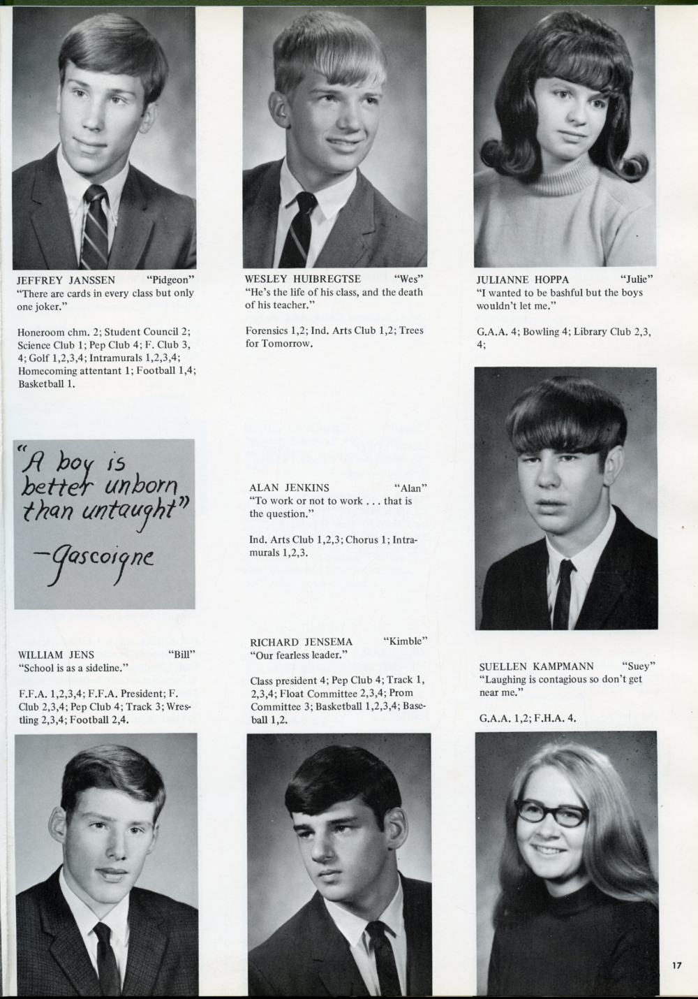 1969 Sheboygan Falls High School, Page 17: Jeffrey Janssen, Wesley Huibregtse, Julianne Hoppa, Alan Jenkins, William Jens, Richard Jensema, Suellen Kampmann.