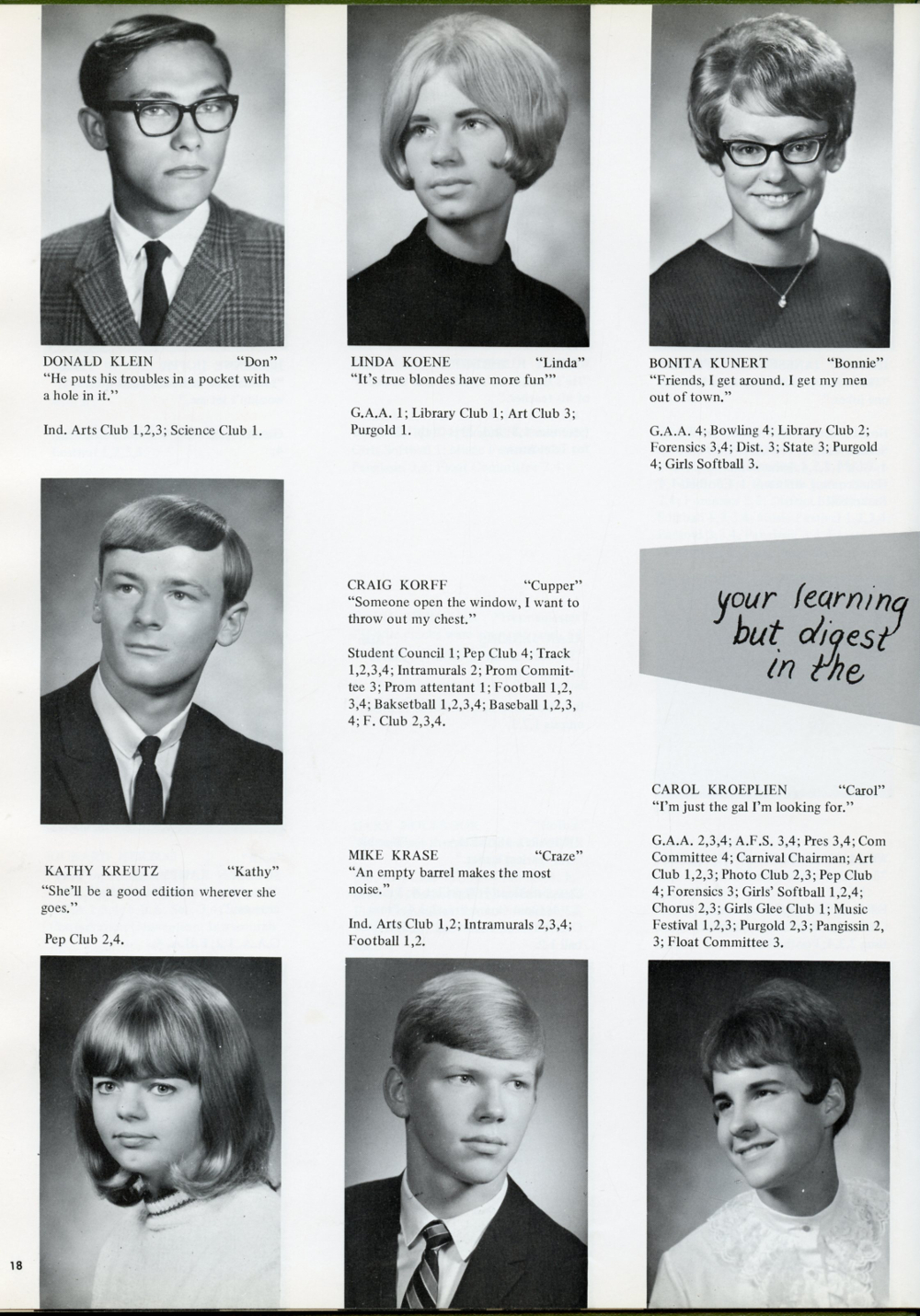 1969 Sheboygan Falls High School, Page 18: Donald Klein, Linda Koene, Bonita Kunert, Craig Korff, Kathy Kruetz, Mike Krase, Carol Kroeplien.